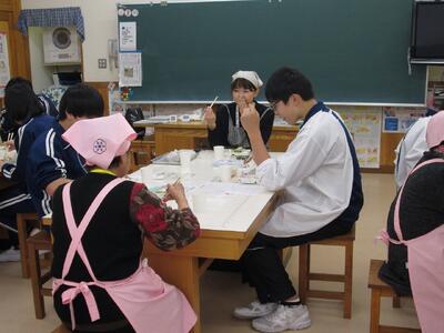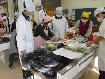 2月15日(水) 9年生は、家庭科の時間に市役所健康課の方と地域ボランティアの方の協力により、お弁当作りを行いました。これから高校に進学すると毎日お弁当を持って行くことになると思います。その時に、今日のお弁当作りの経験が、作ってくれるおうちの方への感謝の気持ちになればいいなと思っています。とてもきれいでおいしいお弁当を作ることができました。