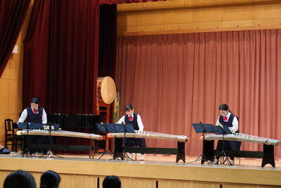中学生各学年による発表です。7年生は「日光市の観光の提案」として、日光地域での学習を生かした飲食店の様子について、8年生は7月のマイチャレンジの活動内容の報告、9年生は琴で「美女と野獣」の演奏と各学年それぞれの学習成果の発表をしました。