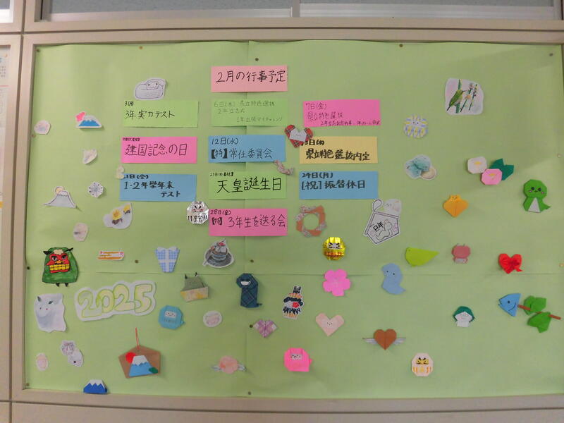 生徒昇降口のクラス表示がリニューアルされました。宇宙をイメージした作品が描かれています。また、2月の行事予定が、掲示されていました。折り紙で、今年の干支「巳」を作成して壁を飾ってくれています。ありがとうございます。