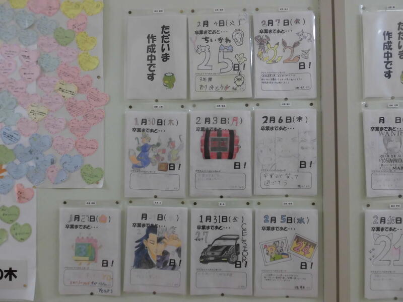 3年生の廊下には、卒業まであと何日といったカードが、掲示されています。あと何日と数えると寂しい限りですが、思い思いのカードを眺めながら、皆さんと過ごした日々を懐かしく思い起こしています。