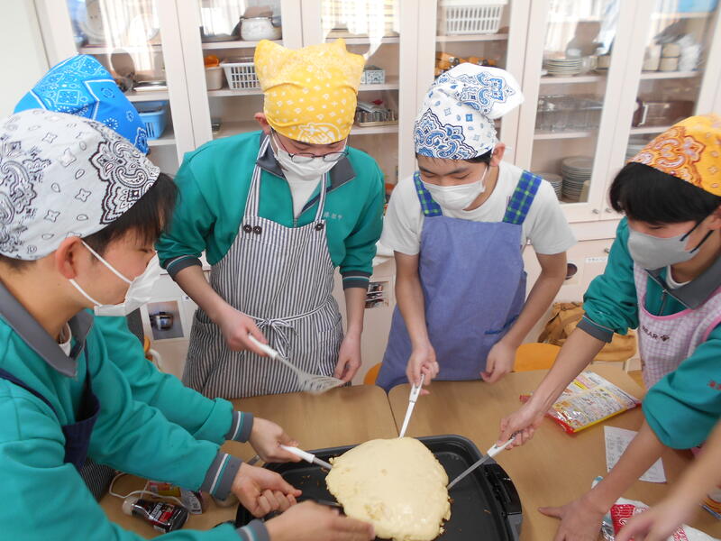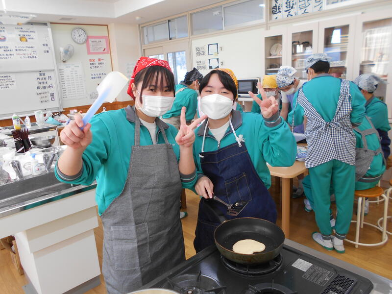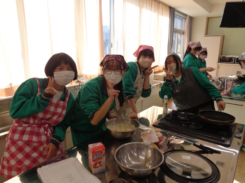 2月27日の5校時目の学級活動の時間に、お楽しみ会を実施しました。内容は、パンケーキ作りです。生クリームをホイップして、季節の果物(いちご)がたくさんのっているパンケーキができあがりました。給食後でしたが、別腹だったようです。残り少ない藤原中学校での友達との楽しそうな触れあいになっていました。家庭科室近くの廊下は、とても甘い香りが漂っていました。