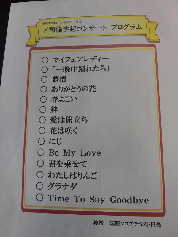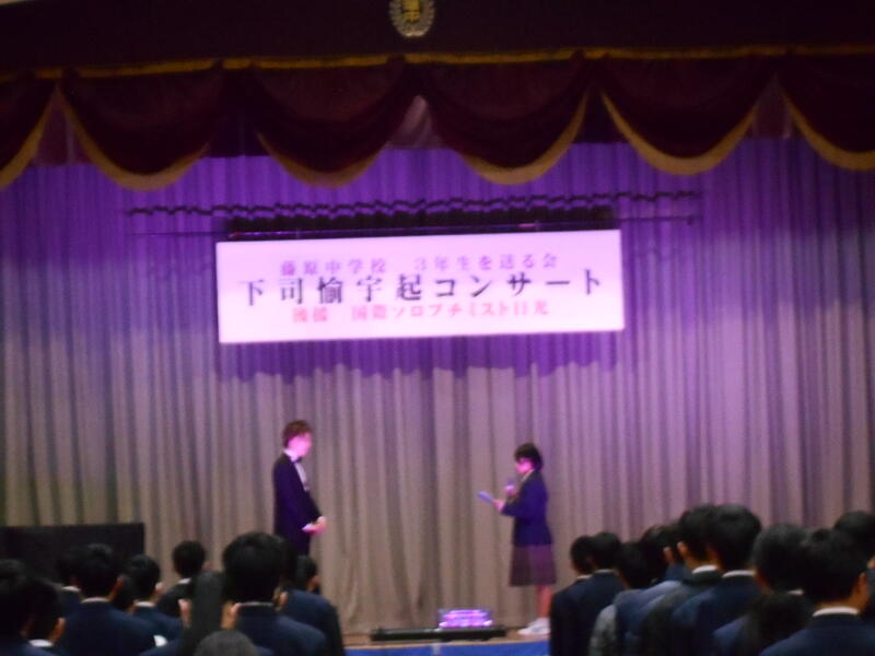 2月28日 午前の部、午後の部に分けて3年生を送る会を行いました。午前の部は、音楽家である 下司愉宇起さん(しもじゆうき)をお招きして、コンサートをしていただきました。プロの歌手の方が、藤原中学校の体育館で美声とトークで60分間という時間のステージでした。今回のコンサートを行うにあたって、国際ソロプチミスト日光の和貝会長をはじめとする会員の方々のご尽力により、実現しました。午後は、思いでスライドを上映して新生徒会役員から3年生へ花束が贈られました。