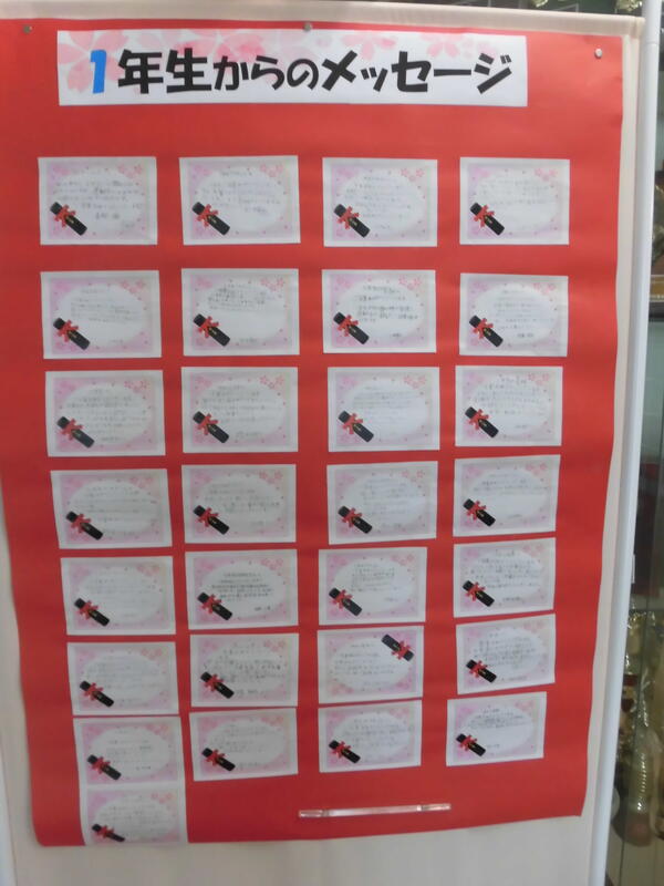 校長室前の廊下に、在校生から卒業する3年生へのメッセージが掲示されました。1,2年生の目に映っている3年生の姿は、いつも輝いていたことが文面から伝わってきます。3月11日の卒業式は、おめでたいことで嬉しくも淋しい気持ちです。