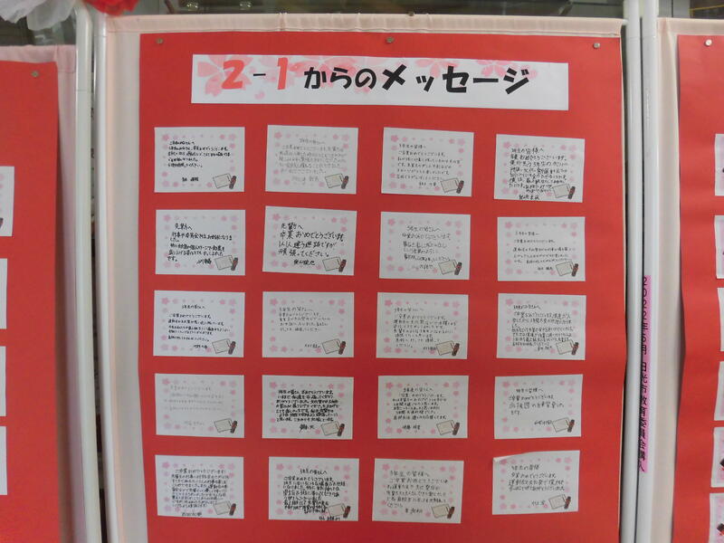 明日の卒業式を前に、1、2年生が清掃や会場の飾り付け等を行ってくれました。また、多くの方より御祝辞をいただきました。体育館後方に掲示してありますので、当日御覧ください。