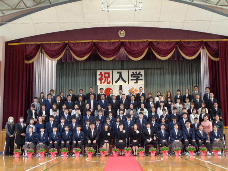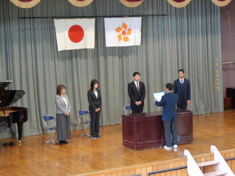 4月9日(水)うららかな春の日差しと、2分咲きの桜が美しい藤原中に、37名の1年生が入学しました。御来賓に、本校PTA会長小又隆一様、学校運営協議会委員 斎藤和義様、髙木康弘様の御臨席を賜り、厳粛かつ穏やかな式を執り行うことができました。37名の新入生一人一人、しっかりと返事をして、担任の先生の呼名に応えていました。PTA会長祝辞では、やらなければならないこと(クラスの仲間の名前を覚える、先生方の名前を覚える、藤原中学校の校歌を覚える)や様々な行事や部活動、勉強を行うなかで、夢中になれることをみつけてくださいといった、エールをいただきました。