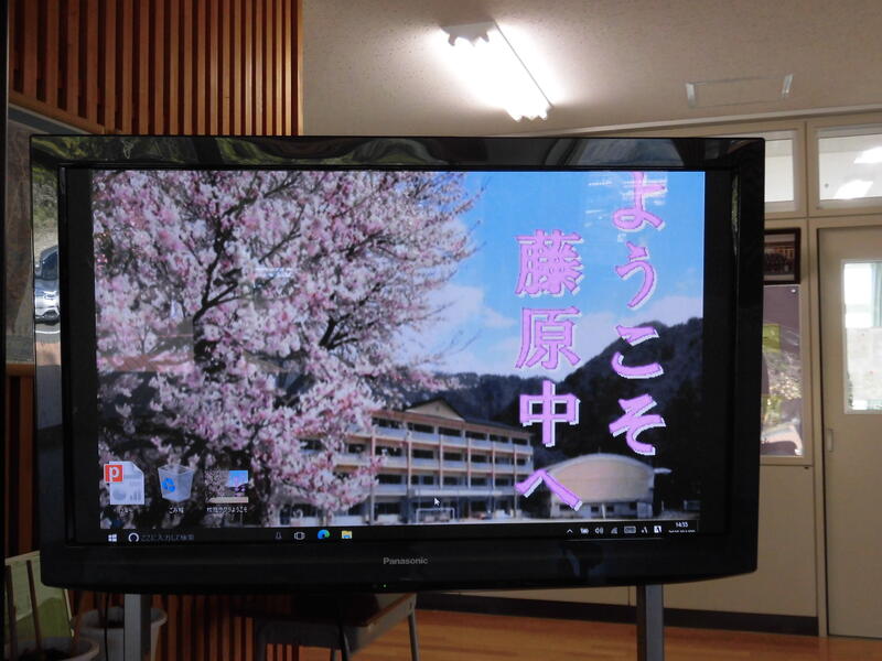 職員玄関前に、Welcomeボードと称したテレビを設置しました。本校にお出でいただいた方へのメッセージや季節に応じた写真などを映し出そうと考えています。どうぞ、ICT化している本校にお越しの際は、ご覧ください。