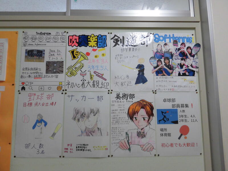 新入生への部活動勧誘ポスターをいち早く作成し、職員室前の壁に掲示しました。本格的な部活動勧誘前の、各部趣向を凝らしたポスターとなっています。1年生の皆さん、じっくり考えて部活動について検討してみてください。