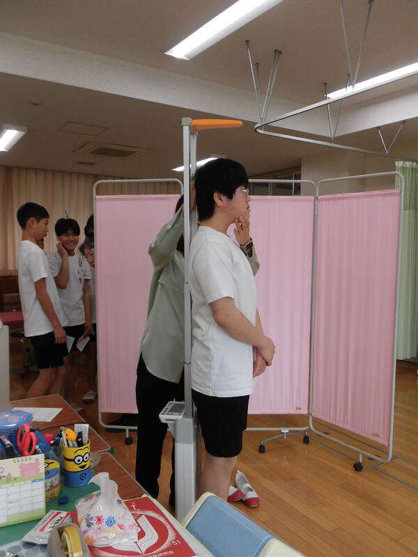 1年生は、桜の木の前で記念写真を撮ったり、教室で学校生活の過ごし方やルールを学んでいました。37名分の机が並ぶ教室は、なかなかぎゅうぎゅうでした。学校探検も行っていました。2年生は、学級活動の時間に、1学期頑張りたいことを作文に書いていました。3年生は、身体計測を行っていて、身長がかなり伸びたという声が聞こえてきました。穏やかな、1日を各学年過ごしていました。