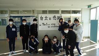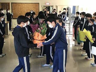 メッセージと祈念(合格?)いや記念のお花を在校生代表から3年各クラス代表へ