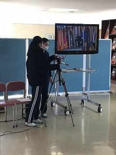 ↑写真では、左側に司会者、正面に校長先生。2台のカメラでZOOM配信しました。