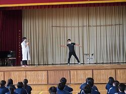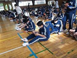 大山先生の指示で、二人組で活動します。「前へ」と言われると「後ろ」に下がります。なかなかこの動きは難しい。みんな思考回路がぐちゃぐちゃになりながら、ゲームを楽しんでいました。タブレットに向かっている写真は「振り返り」をしている所です。「久しぶりに大人数で楽しかった。」「言葉と体が逆に動くので何が何だかわからなくなった」などと振りかえっていました。