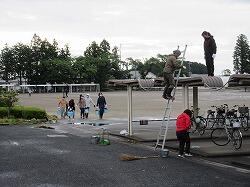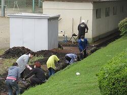 今回の作業は、力仕事が多くありました。側溝を掘り下げたり、土留めをしたり、低地に砂をまいたり、枯れ枝を何度も運んだり、駐輪場屋根に登ったり根気のいる作業が続きましたが、みなさん熱心に作業していただきました。水はけがよくなったり、生徒が走るコースの下地ができたり、駐輪場の雨漏りがしなくなったりしました。生徒達にこの活動を知ってほしいですね。PTAもIMCろんな機会に、理なくできる、ミュニティー活動)です。