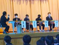 パネラーは粉川市長と代表生徒6名、ファシリテーターは本校の学校運営協議会委員長の小栗卓様です。
