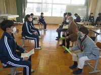 協議会の委員から、「生徒達と直接話を聞いてみたい。」との要望があり、1,2年クラス代表の11名が、それぞれ自分の思いを委員に伝えていました。前半は、各クラスの授業参観で、後半は生徒と委員の一対一の対話の場となりました。