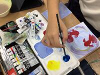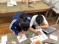 生徒たちは、絵の具を使って、夏ならではのイラストと心のこもった一言をはがきに添えました。