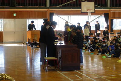 10月の歳時についてお話がありました。「神無月」について、島根県では神様が集まるため「神在月」と言われているということもお話しされました。そして、今の子供たち、先生方と過ごせるのもあと半分となることから、「一日一日を大切に。」とお話しされました。