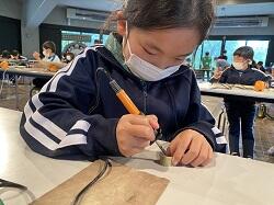 キーホルダーは電熱ペンを使いました。ペン先は熱いので、危険です。ものすごい集中力です!