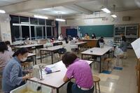 仕上げのニスを塗る前に、絵の具を乾かしています。みんな、扇風機の前で乾くのをまっています。