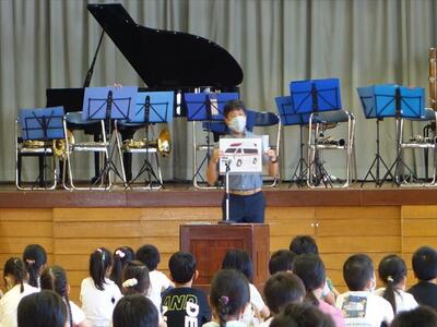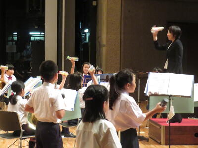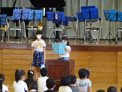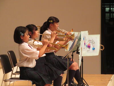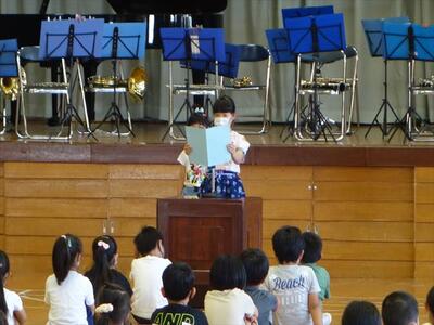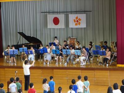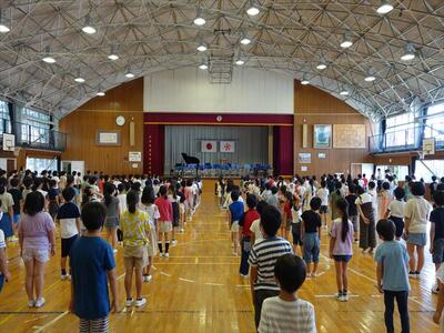 児童の発表後は校歌斉唱がありました。吹奏楽部の上手な演奏にきれいな子どもたちの歌声が重なっていました。吹奏楽部のみなさんには、2学期の運動会をはじめ、音楽祭など、さまざまな機会で活躍してくれることを期待しています。