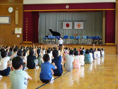 石川校長先生のお話では、1学期に子どもたちが元気に笑顔でがんばっていたことの労いをされていました。子どもたちに元気に笑顔で生活できたか問いかけると、多くの子どもたちが手を挙げていました。2学期も子どもたちは元気に笑顔でがんばってくれることと思います。