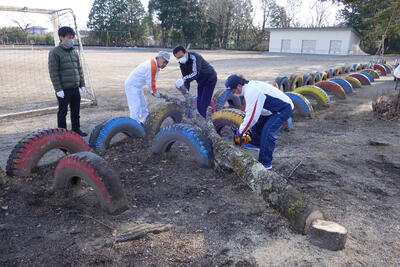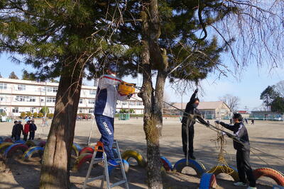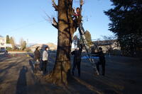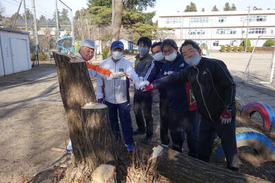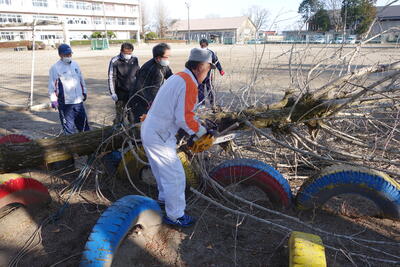 終業式も終わり、教室で子どもたちがクリスマスケーキを食べ終わった頃、校庭に何やら大きな音が聞こえてきました。ふと、校庭に目をやると6人の有志が銀杏の木と朽ちた桜の木を切っているではありませんか。