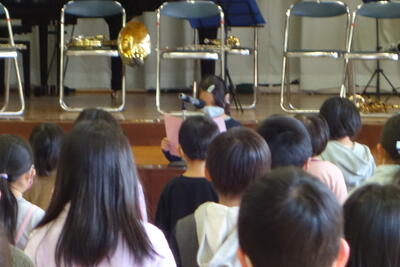 話の合間に、尺八の古典曲やポピュラー音楽、歌謡曲の演奏を交えてくださり、児童は嬉しそうに体を動かしたり、