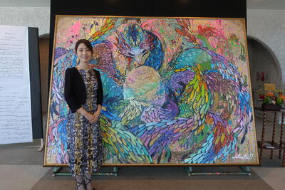 入口にはumiさんと子どもたちで制作し完成した「The Unknown」が披露されていました。この作品自体は今市小に飾られますが、如来寺(日光市今市710)の御朱印としていただけますので、日光市にお越しの際にはぜひ如来寺にお立ち寄りいただけたらと思います。この絵はキャンバス全体にドロップされた絵の具が子どもたちを、翼は親や先生・地域の人たちをあらわし、みんなで守るように中央の卵「全ての可能性」を包み込んでいます。子どもたちの夢や希望の実現のために今市小で見守ってくれることと思います。