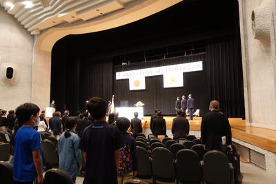 会場の準備終了後に明日の式典の流れを確認しつつリハーサルも行われました。今市小のこれまでの歴史やumiさんとの共同制作の様子の映像も用意されていました。また、明日は、ウエイトリフティング日本代表、オリンピックメダリストの三宅宏美さんの記念講演も予定されています。「勝負に勝てるメンタルの整え方」と題して行われます。三宅さんが集大成として挑んだ東京オリンピックに向けて、どのような困難がありそれをどのように克服していったかお話しいただけると思います。児童のみなさん、保護者のみなさん、明日の記念講演会を楽しみにしていてください。