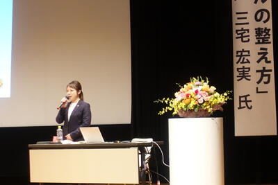 休憩を挟んで後半は、重量挙げオリンピックメダリストの三宅宏実さんの講演です。三宅さんはオリンピックに5大会連続出場と20年以上も世界のトップとして活躍されてきました。どれほどの努力があったことでしょう。講演の際にオリンピックで得た銀メダルと、銅メダルを子どもたち一人一人が手に取り、その大きさや重みを感じていました。三宅さんからはご自身の経験から、「楽しむことで心がつくられる。今を楽しんでほしい。笑顔で失敗を恐れず挑戦してほしい。自分がハッピーであれるように自分のペースを大切にしてほしい。」とお話しされました。お話だけでなく、映像や音楽を交えながら分かりやすい講演でした。子どもたちはトップアスリートの話を聞き、自分の夢や希望について考える機会になったことと思います。