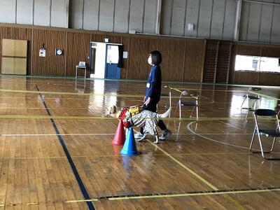 最後に、代表児童が、アイマスクをして盲導犬と一緒に歩く体験をしました。一緒に歩いてくれたのは、「アイル」と「シンディ」の2頭です。曲がり角で止まったり、障害物をよけたりして、安全にゴールまで歩くことができました。