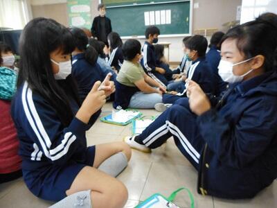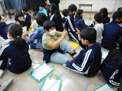 そのあと、耳が聞こえないと困ることについて教えていただきました。目覚ましのアラームや学校のチャイムなど、音だけですと分かりません。そのため、振動や光など、他の形で分かるような工夫をしているそうです。避難所などでは放送が聞こえず、配給されるものをもらい損ねてしまったりすることもあるそうです。そういったときに、どのようにしたら助けることができるか、子どもたちは真剣に考えていました。