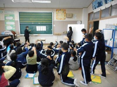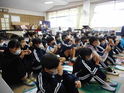 手話教室の最後には、子どもたちは覚えた手話を使って、「ありがとうございました」とあいさつをし、拍手で先生方をお見送りしました。1時間の学習の成果です。