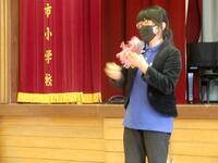 盲導犬についての話では、盲導犬の一生や、町で盲導犬に出会ったときに気を付けることなどについて教えていただきました。さらに、訓練の方法や、どんな仕事をしているかを実際に見せていただきました。