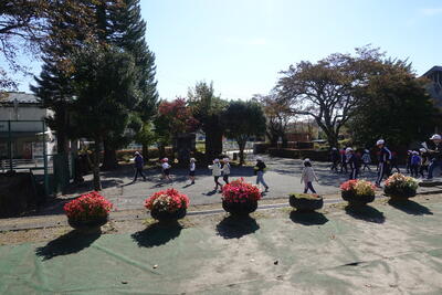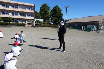 10月26日(水)に体育集会が行われました。今回は「鬼ごっこ」を全校で行いました。1回目は3年生が吸血鬼(赤帽子)となり全校生を追いかけました。捕まった子どもは白帽子を赤帽子に変え、吸血鬼として白帽子の子どもを追いかけます。ほんの数分で吸血鬼だらけになっていました。2回目は4年生でした。さすがに3年生のときよりも早く吸血鬼だらけになりました。最後は1・2年生が吸血鬼になりました。小さいかわいらしい吸血鬼が束になって上級生を追いかける光景がとても微笑ましかったです。また、特別参加としてキット先生がジェイソンとして鬼になり最後まで子どもたちを追いかけました。