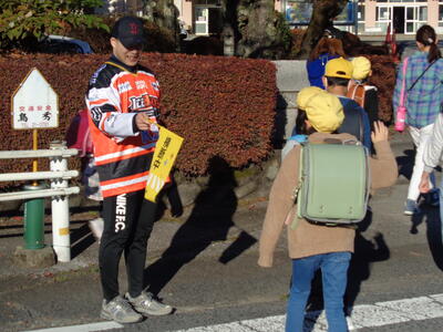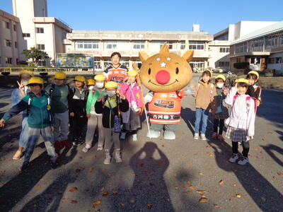 11月1日(水)にH.C.栃木日光アイスバックスの「しかっち見守り隊」として、石川貴大選手と宮田大輔選手、そしてマスコットキャラクターのしかっちさんが、登校時の安全を見守ってくれました。石川選手・宮田選手・しかっちさんに子どもたちは大喜びで、握手をしたり写真を撮ったりしました。
