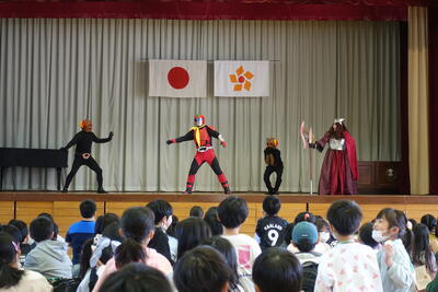 後半には特別ゲストとして「オクニッコーマン」さんに来ていただき、ヒーローショーを行っていただきました。子どもたちから大歓声が上がっていました。