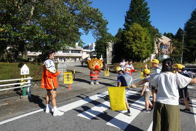 9月5日(木)にH.C.栃木日光アイスバックスのみなさんが「しかっち見守り隊」として、朝の交通安全指導に来てくださいました。本校の卒業生である石川選手と大塚選手をはじめとして、マスコットキャラクターのしかっちさんなどが、横断歩道に立ち、登校時の安全を見守ってくれました。