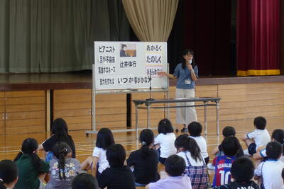 校長先生からは、全盲のピアニストである辻井伸行さんの話を取り上げ、「あかるく」「たのしく」「あきらめない」を合言葉にして努力してきたこと、「努力をすればいつか夢がかなう」というお話しをいただきました。子どもたちは真剣に校長先生の話に耳を傾けていました。