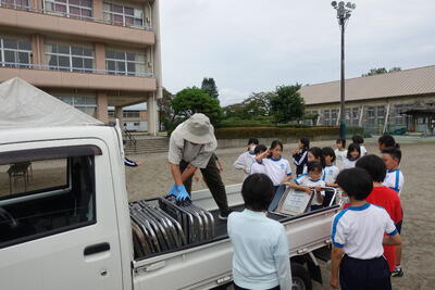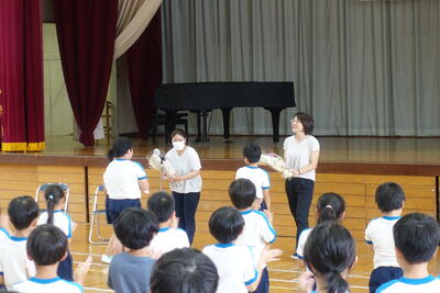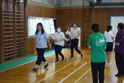 9月13日(金)に7月から今日まで給食の準備や片付けに御協力いただいたボランティア2名の方に感謝の会を開きました。体育館に来ていただき、子供たちからお礼として感謝のことばと花束をお贈りました。