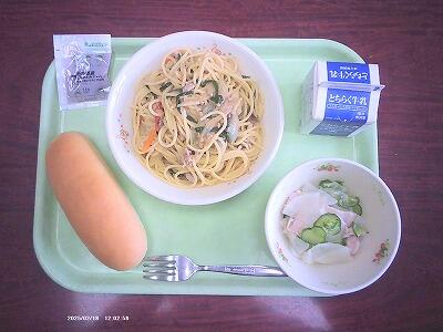 【献立】コッペパン とちおとめジャム 牛乳 にらとひき肉のスパゲティ ハムと大根のサラダ