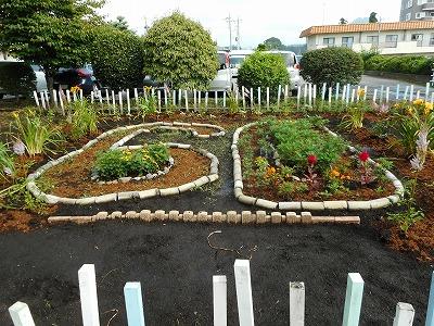 子どもたち、地域の方々の御協力をいただいきまもなく完成です。「今二shガーデン?」是非見に来てください。