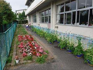 校庭のあじさいの花がきれいに咲いています。昇降口前花壇には、かわいいパンジーがそろいました。人権の花も1年生の朝顔も元気です。