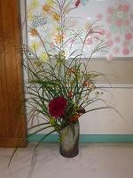 児童昇降口の生け花も、