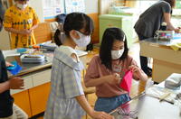 一人一人が真剣に作業に取り組み、先生のアドバイスをもらいながら、全員がボタン付きの作品を作りました。どの作品も、丁寧に縫ってあり、みんなの頑張りが感じられるものでした。