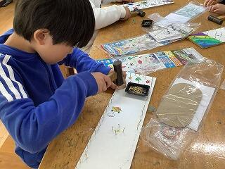 釘を何本も打ちこみ、コリントゲームのコース作りを楽しんでいます。