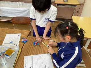 比べるだけではなく、ものの重さを数で表すために、数え棒いくつ分の重さになるのかも調べました。