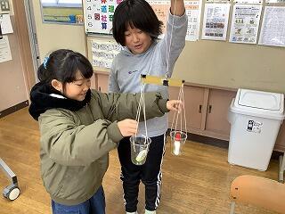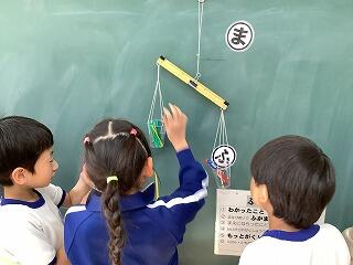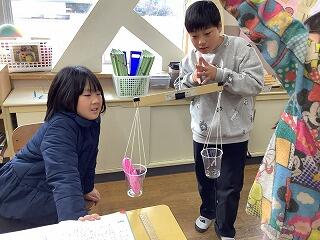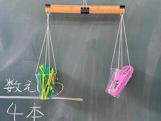 算数では、自作の天秤を使って、ものの重さ比べをしています。