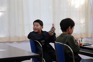 算数では、自作の天秤を使って、ものの重さ比べをしています。