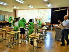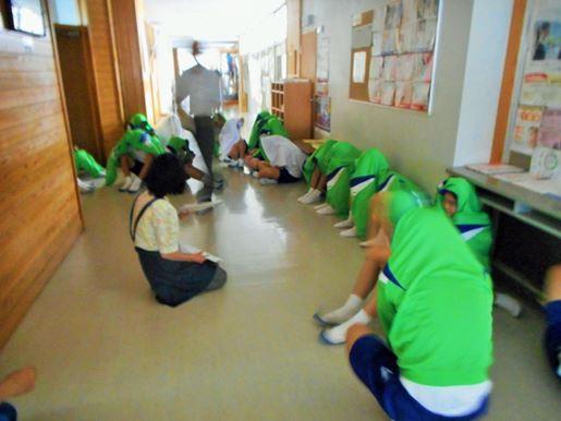 竜巻の接近を想定した避難訓練を実施しました。教室にいる生徒は、窓とカーテンを閉めて、窓の少ない1階廊下に避難しました。