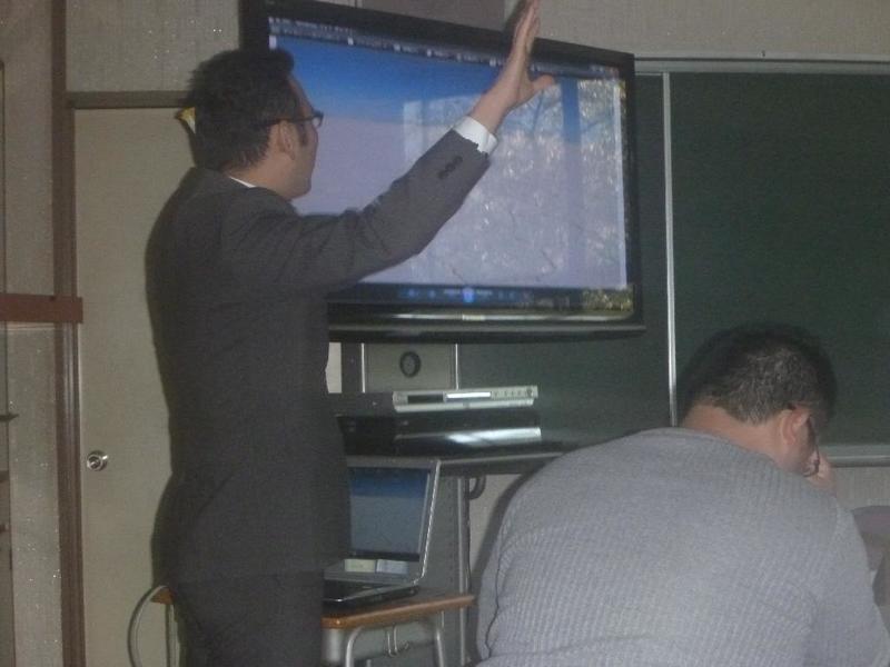 「地図オタクの二人です。」 新井先生と、ちょっと若い村田先生です。 「わくわく島」の教材にみんな真剣です